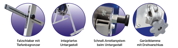 | • | Integriertes Untergestell – so muss kein externes Gestell mitgeführt werden und der Transport ist erheblich einfacher |